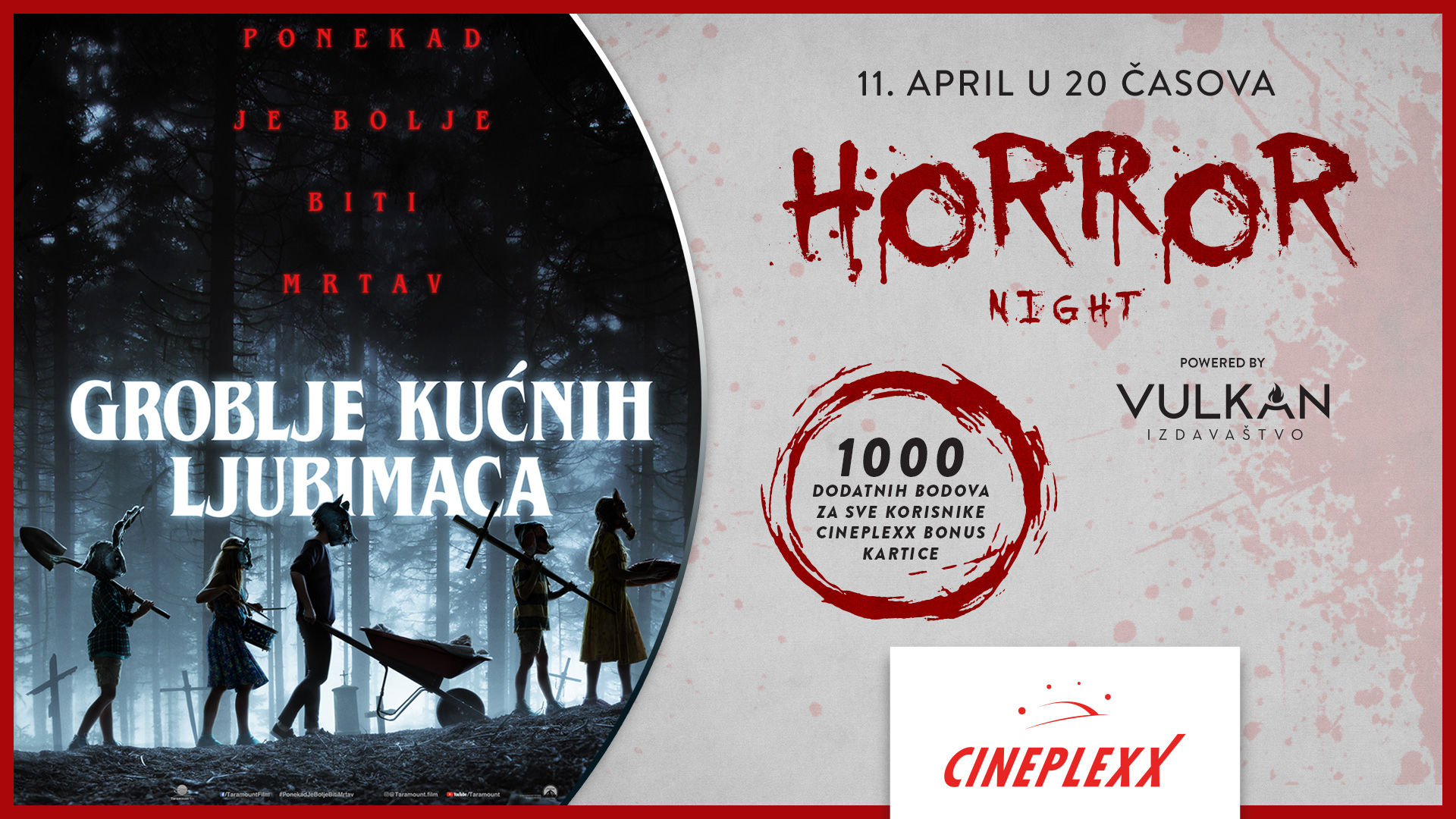 Beograd, 05.04.2019 – Saznajte šta se krije na misterioznom groblju kućnih ljubimaca, na Horror night događaju u svim bioskopima Cineplexx. Posetioce, članove Cineplexx bonus kluba očekuje 1000 dodatnih bodova pri kupovini ulaznica za projekciju filma u četvrtak 11. aprila u 20 časova, a najsrećnije i poklon knjiga Stivena Kinga, koju daruje Vulkan Izdavaštvo. Karte su u prodaji na blagajnama bioskopa!