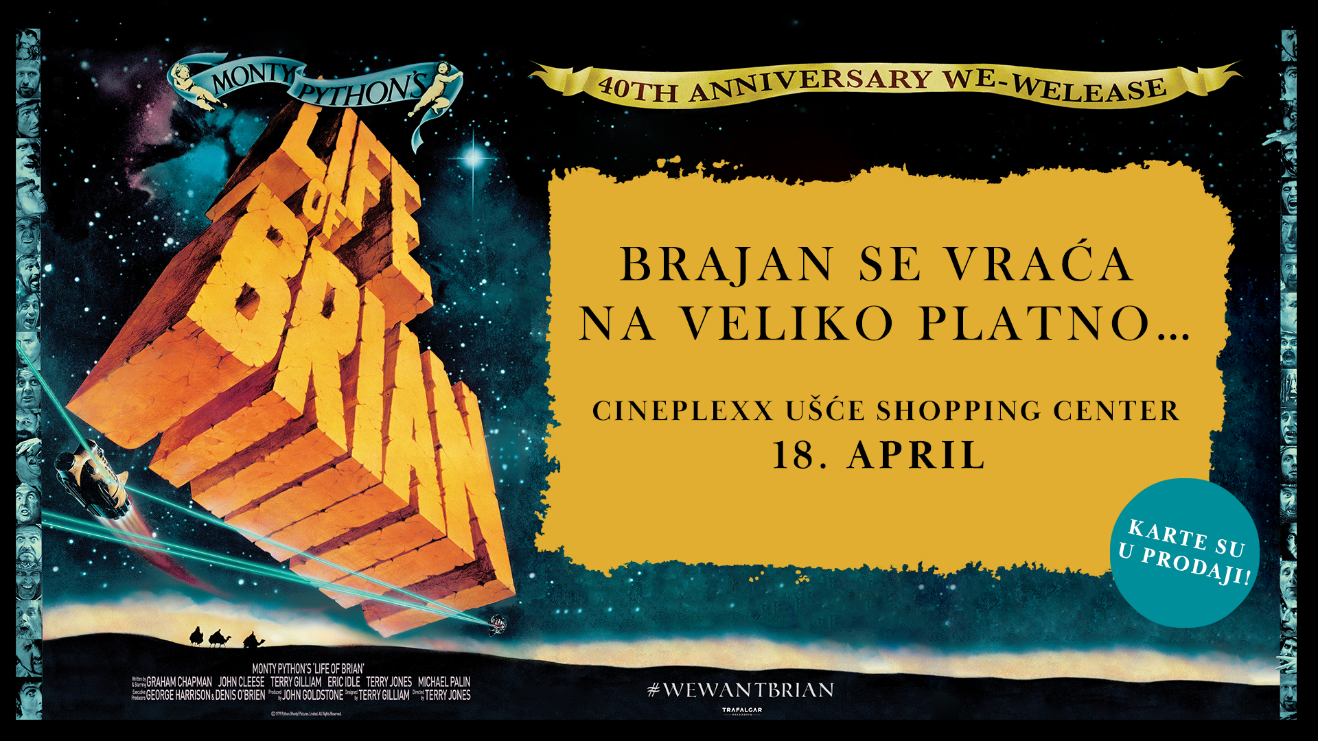 Beograd, 08.04.2019 – Monti Pajtonovci se vraćaju u velikom stilu, 40 godina nakon prvog prikazivanja, na velikom platnu bioskopa Cineplexx UŠĆE Shopping Center u filmu iz 1979, ,,Žitije Brajanovo“ (Life of Brian). Krajnje kontroverzan film od samog objavljivanja, zabranjen u nekoliko zemalja, označen kao jedna od najboljih komedija svih vremena, biće prikazan na specijalnoj projekciji u četvrtak, 18. aprila u 19:30 časova. Karte su u prodaji na blagajni bioskopa.