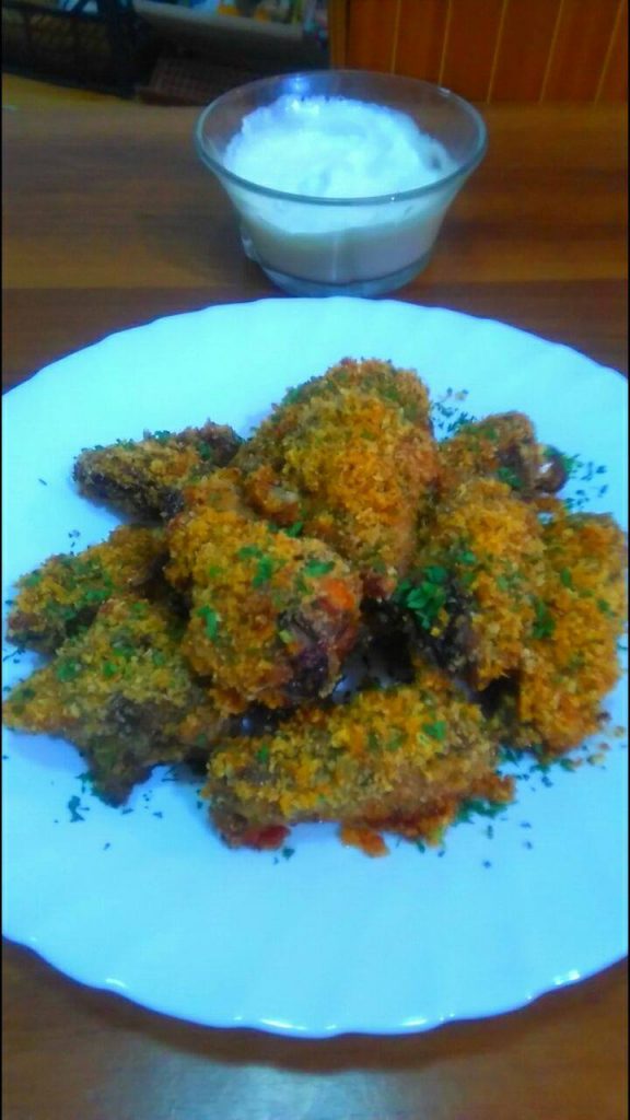 Odstranila sam vrhove krilaca jer na njima nema mesa, tako da sam koristila samo mesnate delove, koje sam isekla na parčiće veličine par zalogaja, otprilike jedno krilce sečete u dva dela. Posolite ih i pobiberite. U činiji pomešate parmezan, prezle, beli luk u prahu, seckani ili sušeni peršun i alevu papriku. Podmažete puterom ili uljem tepsiju ili posudu u kojoj ćete peći. Valjate krilca u mešavinu, koju ste napravili i to vrlo temeljno uvaljate. Ređate u tepsiju dok vam se greje rerna. Prelijte uljem ili puterom odozgo i pospite mešavinom ako vam je ostane. Pečete ih pola sata ili dok krilca ne porumene u rerni zagrejanoj na 200 stepeni. To što oblećete oko rerne dok se peku jer mnogo dobro miriše, ne ubrzava proces pečenja. Što se tiče sosa on nije obavezan ali daje neverovatan šmek krilcima, kad ga umočite u isti. Krilca su od spolja hrskava i mirisna, iznutra sočna, a sos im dodaje osvežavajući ukus. Sos vam je jedna kisela pavlaka i nekoliko kašika majoneza, pomešano u činiji. I to je to. Vaše sjajno jelo ili ponoćni doručak je spreman. Javite kako vam se dopada, pišite mi u komentarima. Prijatno.